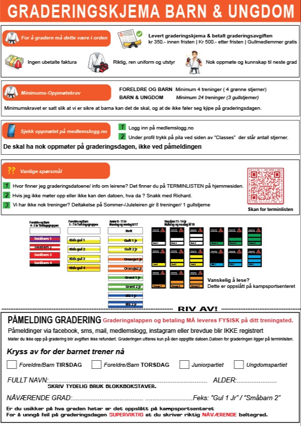 Oppmelding til gradering må skje innen 4 mai, du er påmeldt når du har levert graderingslappen på kampsportsenteret og betalt graderingsavgiften kr 350.